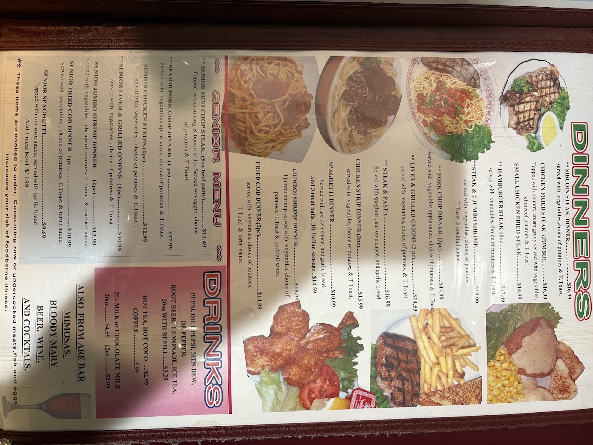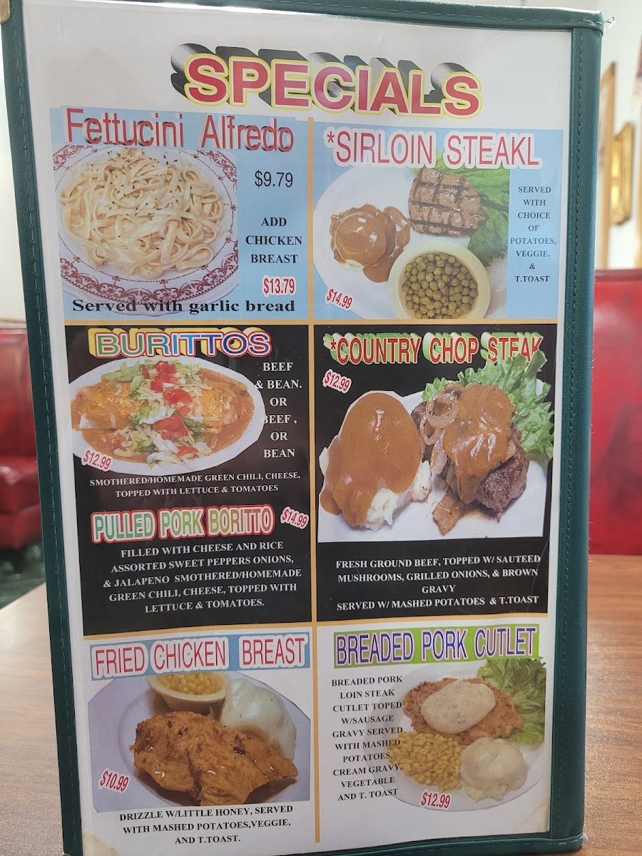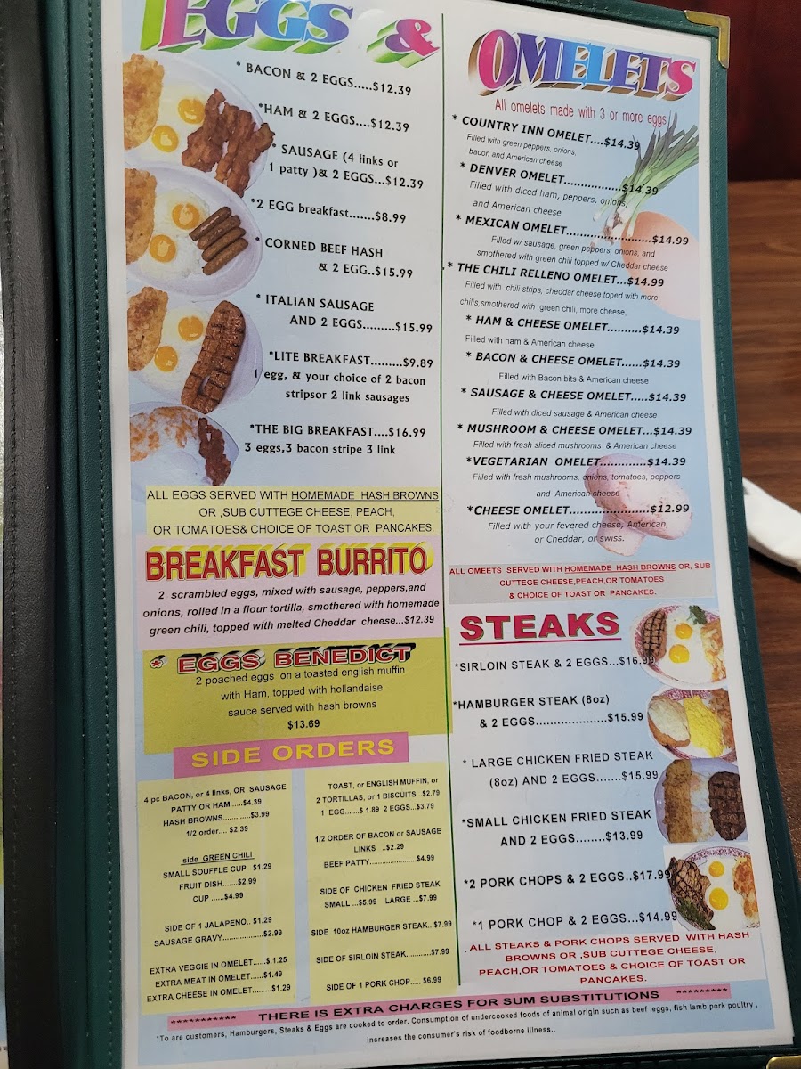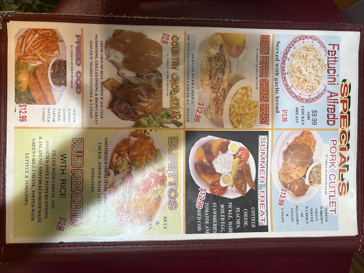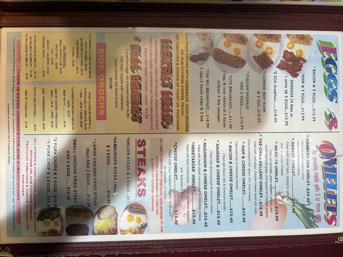 At The Country Inn Restaurant, every meal feels like a home-cooked delight. Nestled at 1415 8th Ave in Greeley, CO, this cozy spot offers a menu that highlights hearty, comforting dishes, perfect for any occasion. Whether you're in the mood for a savory breakfast to kickstart your day or a satisfying dinner with friends and family, the The Country Inn Restaurant Menu delivers something for everyone. From tender steaks to flavorful seafood, each dish is prepared with care and the finest ingredients. Pair your meal with a selection of homemade sides and finish it off with a sweet treat. This is more than just a meal - it's a warm, welcoming experience that makes you feel right at home.
